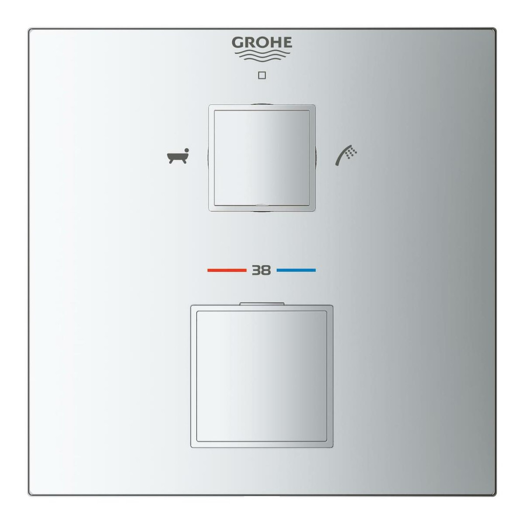 Dotaz na produkt Na splátky ještě dnesTermostatická sprchová baterie Grohtherm Cube poslouží jako dokonalý finální prvek vaší nové vany. Umožňuje snadné přepínání mezi sprchou a vanovou výpustí. Průtok je možné snadno regulovat díky technologii GROHE AquaDimmer, která vám dovolí současně nasměrovat vodu tam, kam chcete, a nastavit objem tekoucí vody. Její atraktivní, čtvercový design, který se dokonale hodí k bateriím GROHE Eurocube, vás bude vybízet k interakci prostřednictvím intuitivních ovládacích prvků, zatímco štíhlá konstrukce (tloušťka nástěnného panelu pouhých 10 mm, celkový přesah 43 mm) z baterie činí ideální doplněk minimalistických prostorů. Tato termostatická baterie se vyrábí v Německu a je plná inovativních technologií. Technologie GROHE TurboStat zabraňuje nepříjemným teplotním výkyvům. Obavy z popálení se stanou minulostí díky tlačítkové pojistce GROHE SafeStop, která zabraňuje nechtěnému nastavení teploty vyšší než 38 °C. Volitelná pojistka GROHE SafeStop Plus poté slouží jako přídavná úroveň zabezpečení na teplotní hranici 43 °C. Robustní chromová povrchová úprava GROHE StarLight zaručuje zachování zářivého lesku po mnoho let. Systém GROHE QuickFix s patentovaným uzamykacím mechanismem a krytými šrouby s těsněním činí instalaci rychlou a jednoduchou. Mějte prosím na paměti, že tuto baterii je možné zapojit pouze v kombinaci s podomítkovým tělesem GROHE Rapido SmartBox (35600000). A můžete se spolehnout: Toto kombinované řešení pro podomítkovou instalaci je 100% utěsněno a zabezpečeno proti úniku vody.