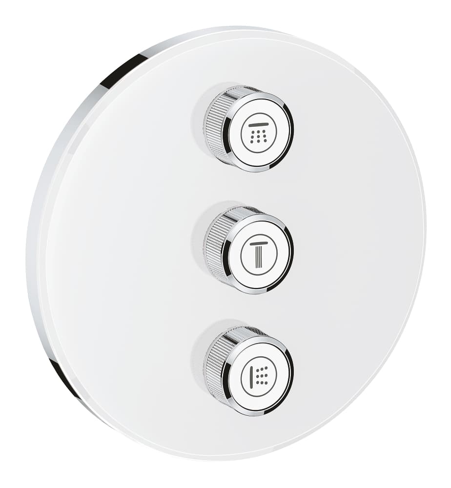 Sprchová/vanová baterie Grohtherm SmartControl pro podomítkovou instalaci, 3 ventily. Zaoblené tvary, povrchová úprava Moon White, vyrobeno v Německu společností GROHE.
