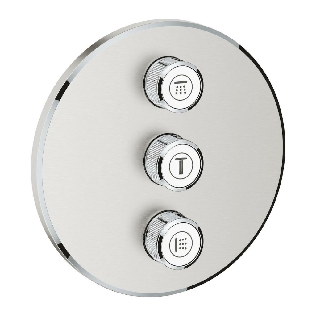 Sprchová/vanová baterie Grohtherm SmartControl pro podomítkovou instalaci, 3 ventily. Zaoblené tvary, povrchová úprava z nerezové oceli, vyrobeno v Německu společností GROHE.