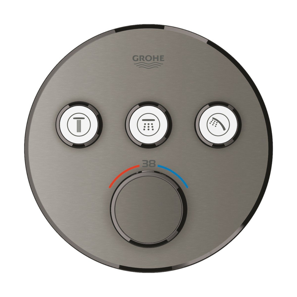 Dotaz na produkt Na splátky ještě dnesZvolte takovou termostatickou baterii, která je dostatečně flexibilní a inteligentní, a která se každý den postará o nezapomenutelnou koupel nebo sprchu. Podomítková termostatická baterie Grohtherm SmartControl v provedení Brushed Hard Graphite se pyšní čistým, kosmopolitním designem a umožní vám ovládat několik zdrojů vody současně. Inovativní technologie SmartControl vám umožní přepínat mezi požadovanými zdroji proudu a regulovat objem vody a její teplotu pomocí otočných tlačítek. Tři ventily vám nabízí naprostou flexibilitu a volnost při plánování vaší nové sprchy. Můžete ovládat, přepínat nebo kombinovat různé režimy proudu a jejich zdroje, což je optimální do koupelen, které chcete vybavit hlavovou a ruční sprchou společně s bočními tryskami nebo vanovou výpustí. Integrovaná technologie GROHE TurboStat zabraňuje nepříjemným teplotním výkyvům. Značení GROHE EasyLogic a vroubkovaná tlačítka s vyměnitelnými symboly činí ovládání mimořádně intuitivním. Bezpečnostní pojistka GROHE SafeStop zabraňuje nastavení teploty vyšší než 38 °C, aby nebylo možné se popálit, zatímco volitelná pojistka GROHE SafeStop Plus dále zabraňuje nastavení vyšší teploty než 43 °C, což je přidaná úroveň zabezpečení. Baterie je tak dokonale vhodná do rodinných koupelen. Úsporná technologie GROHE EcoJoy vám nabídne snížený průtok vody bez jakéhokoliv kompromisu ve výkonu a požitku. Systém GROHE QuickFix zajišťuje jednoznačnou a bezproblémovou montáž této prémiové baterie. Štíhlá konstrukce zásadně usnadňuje čistění baterie, zatímco blyštivý, odolný chromový povrch GROHE StarLight zajišťuje dokonalý vzhled po celou dlouhou dobu životnosti. Tato baterie jednoznačně pozvedne úroveň vaší koupelny, a to nejen díky svému minimalistickému designu plného elegantně zaoblených tvarů. Mějte prosím na paměti, že tuto baterii je možné zapojit pouze v kombinaci s podomítkovým tělesem GROHE Rapido SmartBox (35600000).
