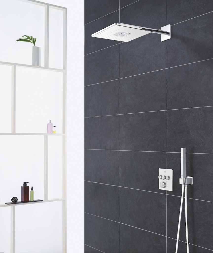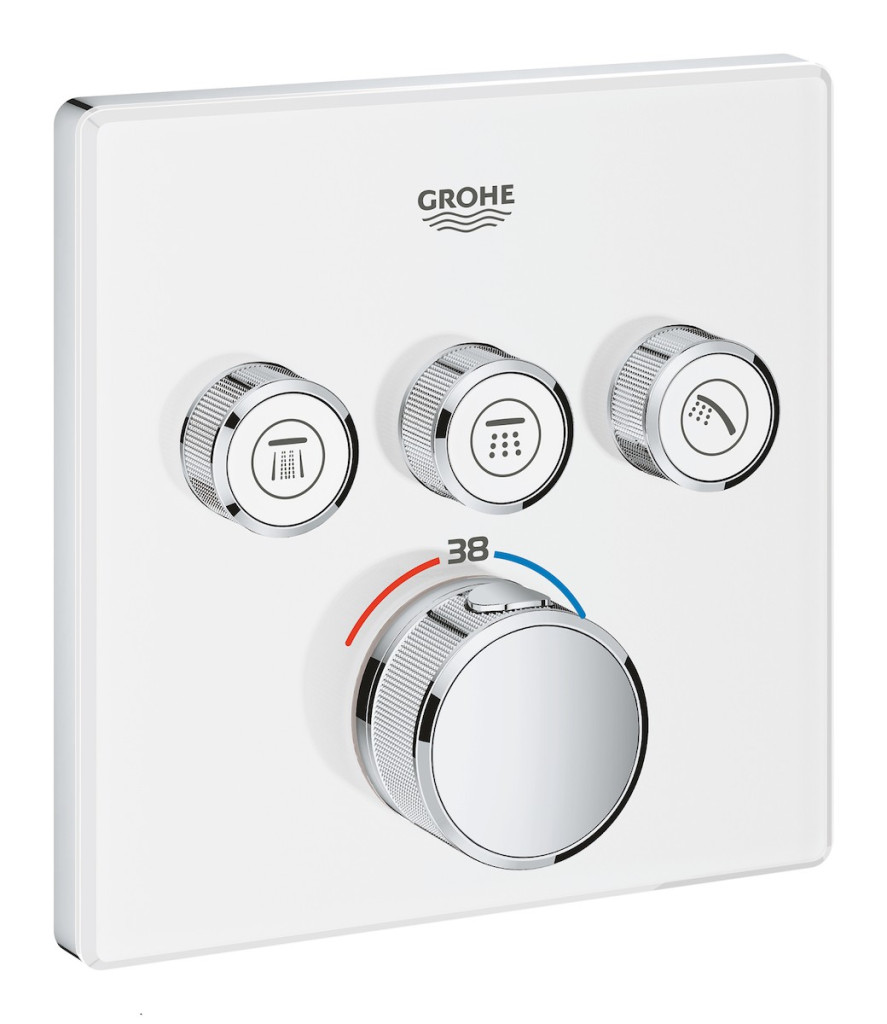 Termostatická sprchová nebo vanová baterie Grohtherm SmartControl pro podomítkovou instalaci, 3 ventily. Čtvercové tvary, povrchová úprava Moon White, vyrobeno v Německu společností GROHE. Ekologický provoz a bezpečnostní technologie