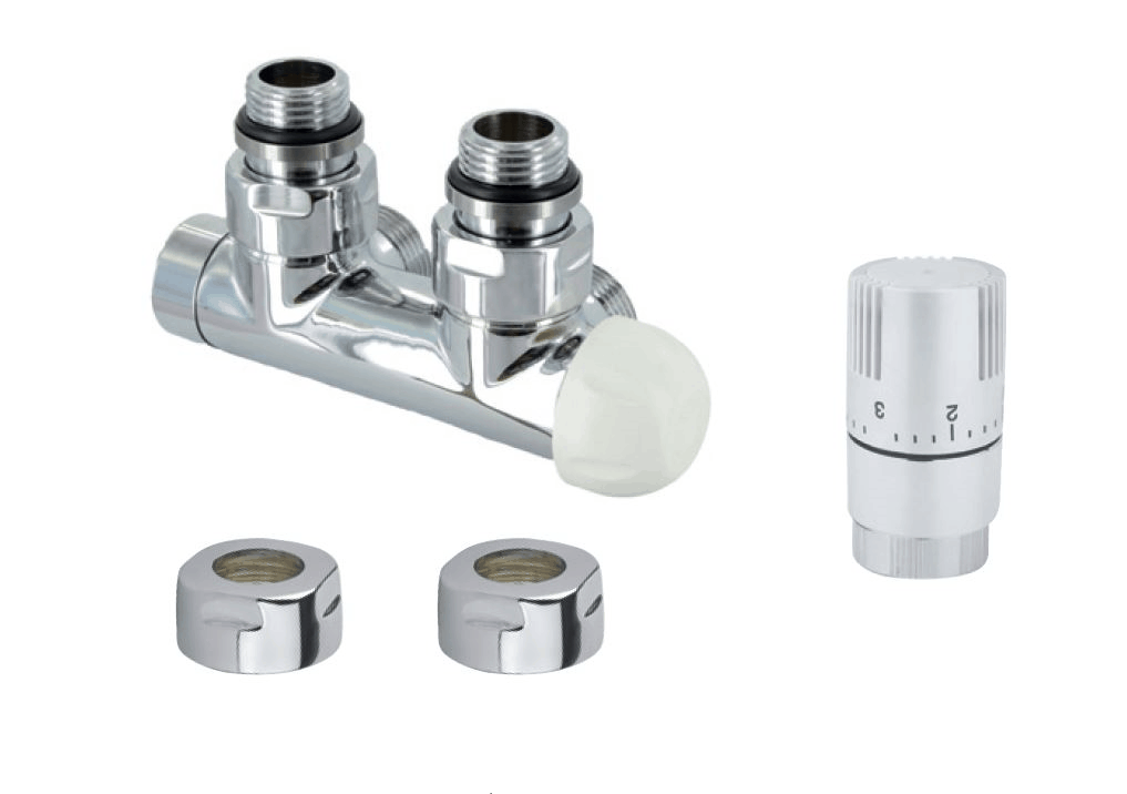 Rohový středový termostatický ventil a šroubení, povrchová úprava – bílá