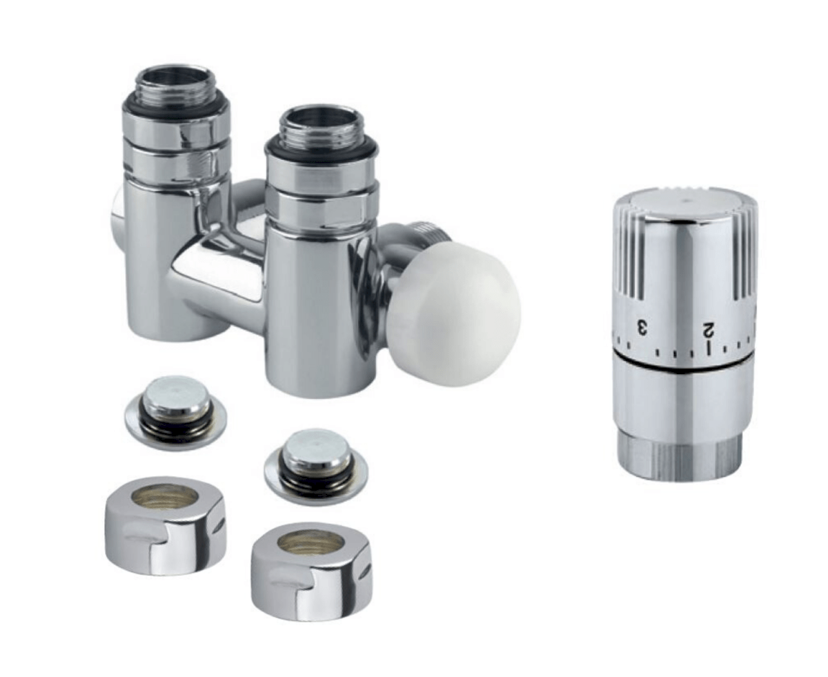 Rohový středový termostatický ventil a šroubení, povrchová úprava – chrom
