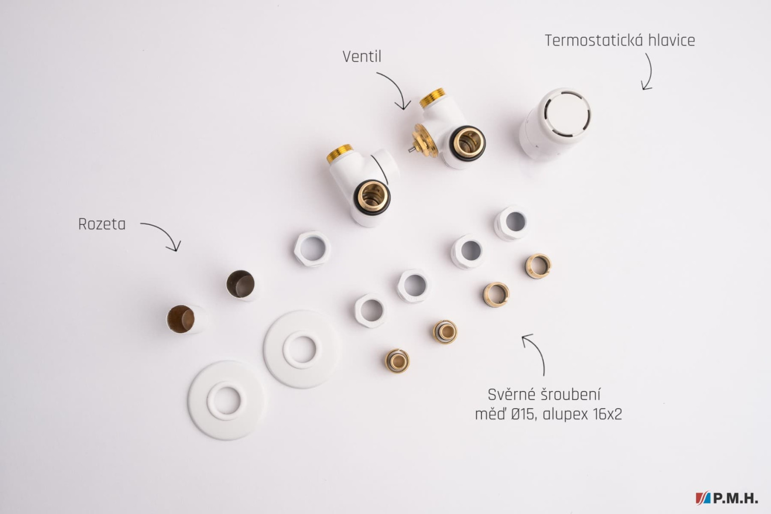 Sada je vhodná pro kombinované vytápění tzv. radiátor lze připojit k ústřednímu (teplovodnímu) vytápění a po dokoupení topné tyče je možné vytápění také z elektriky. Topnou tyč pak instalujete na opačnou stranu radiátoru. Tato sada je levá tzv. ovládací hlavice je nalevo. Není potřeba nic dokupovat, protože sada obsahuje redukce pro připojení k měděným i plastovým trubkám.