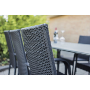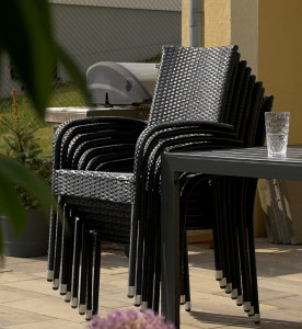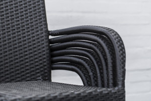 Zahradní židle s ocelovou konstrukcí vypletenou umělým ratanem, která se hodí prakticky kamkoliv. Umělý ratan představuje velmi odolný materiál, který dobře snáší jakékoliv povětrnostní podmínky. Na slunci se nevyšisuje a po dlouhou dobu si uchovává svůj vzhled. Pro delší životnost byla ocelová konstrukce židle ošetřena proti rzi. Stohovatelná, téměř bezúdržbová židle s vyztuženým sedákem, který unese těžší váhy i po delší dobu. Stohovatelný design židle oceníte zejména při uskladnění po sezóně. Židle jednoduše naskládáte na sebe a nezaberou vám mnoho místa.