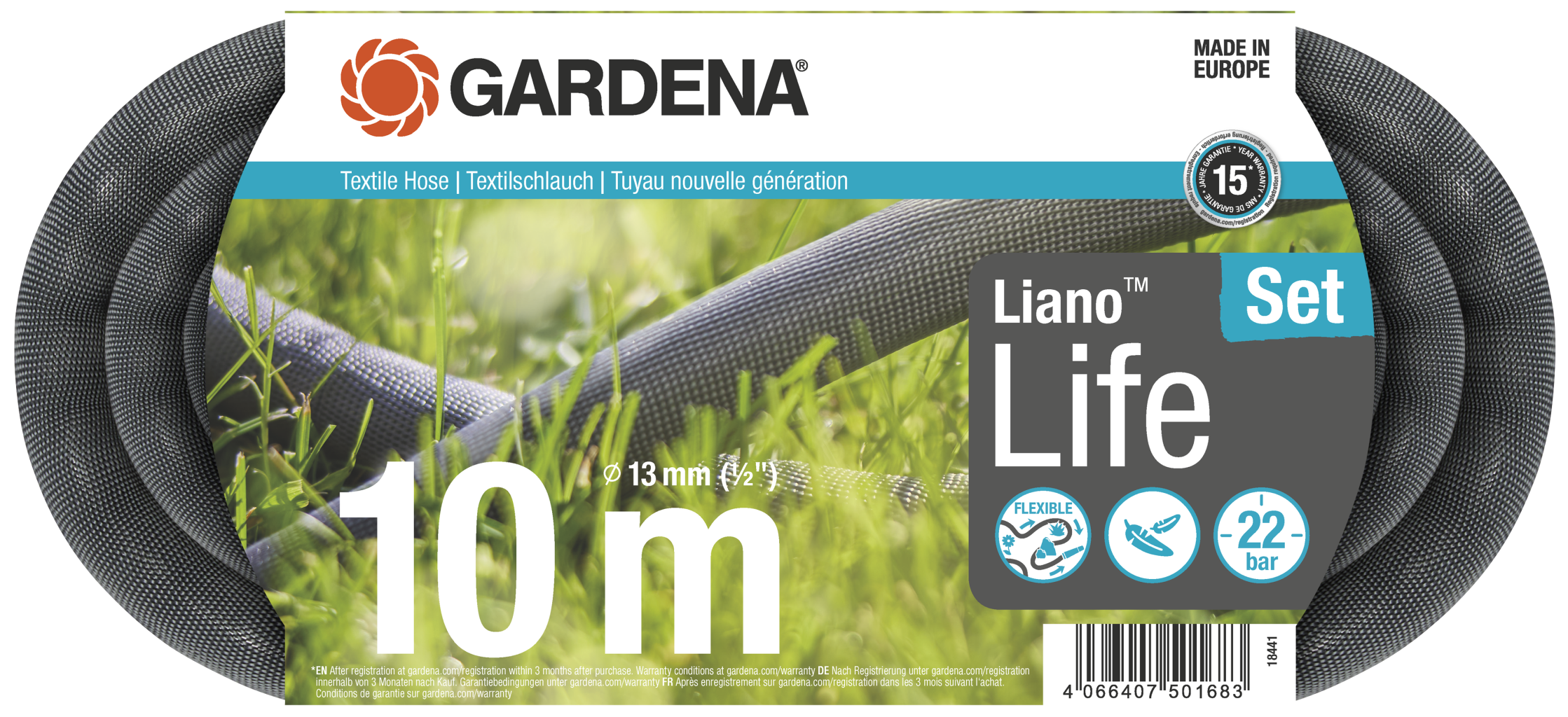 Dotaz na produktTextilní hadice Liano™ Life 10 m prodávané jako sada značky GARDENA je připravena k použití pro krátkodobé a střednědobé zavlažování v malé zahradě. Kromě 10 m dlouhé všestranné textilní hadice o průměru 13 mm (1/2") obsahuje sada předmontované díly Original GARDENA systému, a to rychlospojku Liano™ a stopspojku Liano™, postřikovač a dvě šroubení na vodovodní kohoutek. Jedno ze dvou šroubení na kohoutek je vybaveno redukčním spojem, který umožňuje připojit hadici celkem ke třem velikostem vodovodního kohoutku. Flexibilní vnitřní hadice z PVC a inovativní vnější hadice z odolné textilie zajišťují spolehlivý výkon. Vynikající ohebnost textilní hadice bude skvělým pomocníkem při zavlažování zahrady nebo při úklidu. Její elasticita výrazně usnadňuje manipulaci nad zemí nebo kolem překážek, protože se nezalamuje. Její nízká hmotnost přispívá ke komfortu používání. Hadice Liano™ Life je až o 50 % lehčí než běžné PVC hadice. Díky své příjemné vnější vrstvě se dobře drží. Flexibilita hadice Liano™ Life vám dává velkou výhodu při skladování, protože se snadno přizpůsobí dostupnému úložnému prostoru. Umožňuje to její úsporné skladování například na polici. Tlak, při kterém dojde k jejímu prasknutí, činí 22 barů. Její odolnost vůči UV záření a mrazu umožňuje celoroční venkovní používání. Hadice Liano™ Life neobsahuje škodlivé látky, ani ftaláty (<0,1 %), kadmium, olovo a baryum (<0,1 %). Po registraci na gardena.com/registration do 3 měsíců od nákupu vám GARDENA poskytuje na kvalitní hadici vyrobenou v Evropě záruku výrobce v trvání 15 let. Stvořena pro extrém. Navržena pro každý den. Textilní hadice Liano™.