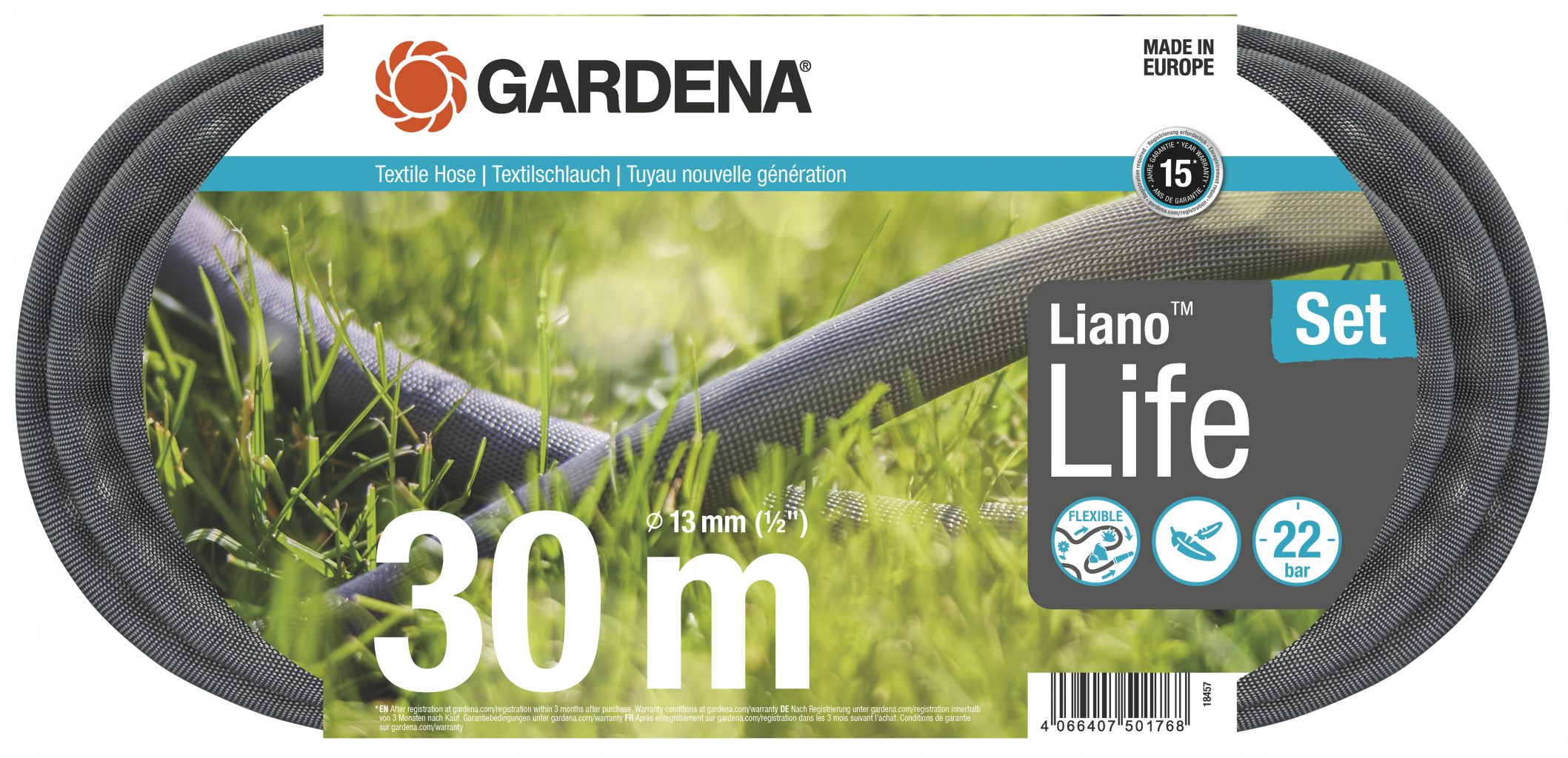 Dotaz na produkt Na splátky ještě dnesSada s textilní hadicí Liano™ Life 30 m značky GARDENA připravená k použití je ideální pro krátkodobé a střednědobé zavlažování. 30 m dlouhý Liano™ Life je ideální pro vaši velkou zahradu. Sada obsahuje všestrannou textilní hadici o průměru 13 mm (1/2"), předmontované díly Original GARDENA System rychlospojku Liano™ a také stopspojku Liano™, čisticí postřikovač a dvě šroubení na vodovodní kohoutek. Redukční kus v jednom ze dvou šroubení umožňuje připojení až ke třem velikostem kohoutku. Liano™ Life se skládá z flexibilní vnitřní hadice z PVC a inovativní vnější hadice vyrobené z odolné textilie, což zajišťuje její spolehlivý výkon. Při zavlažování zahrady nebo úklidu kolem domu ohromí flexibilní Liano™ Life svou pohodlnou manipulací. Díky příjemnému pocitu dobře padne do ruky, při manévrování se nekroutí ani nezamotává a lze ji snadno vést kolem překážek. Nízká hmotnost textilní hadice je výhodná zejména pro delší použití: je až o 50 % lehčí než běžné PVC hadice. Díky své elasticitě lze Liano™ Life skladovat prostorově úsporným způsobem. Ať už na polici nebo v garáži: textilní hadice se přizpůsobí dostupnému úložnému prostoru. Tlak, při kterém dojde k prasknutí hadice Liano™ Life, činí 22 barů. Může být dokonce skladována venku, protože je odolná vůči UV záření a mrazu. Hadice bez škodlivých látek navíc neobsahuje ftaláty (<0,1 %) ani kadmium, olovo a baryum (<0,1 %). GARDENA podporuje textilní hadici Liano™ Life, která se vyrábí v Evropě, s 15letou zárukou výrobce po registraci na gardena.com/registration do 3 měsíců od nákupu. Stvořena pro extrém. Navržena pro každý den. Textilní hadice Liano™.