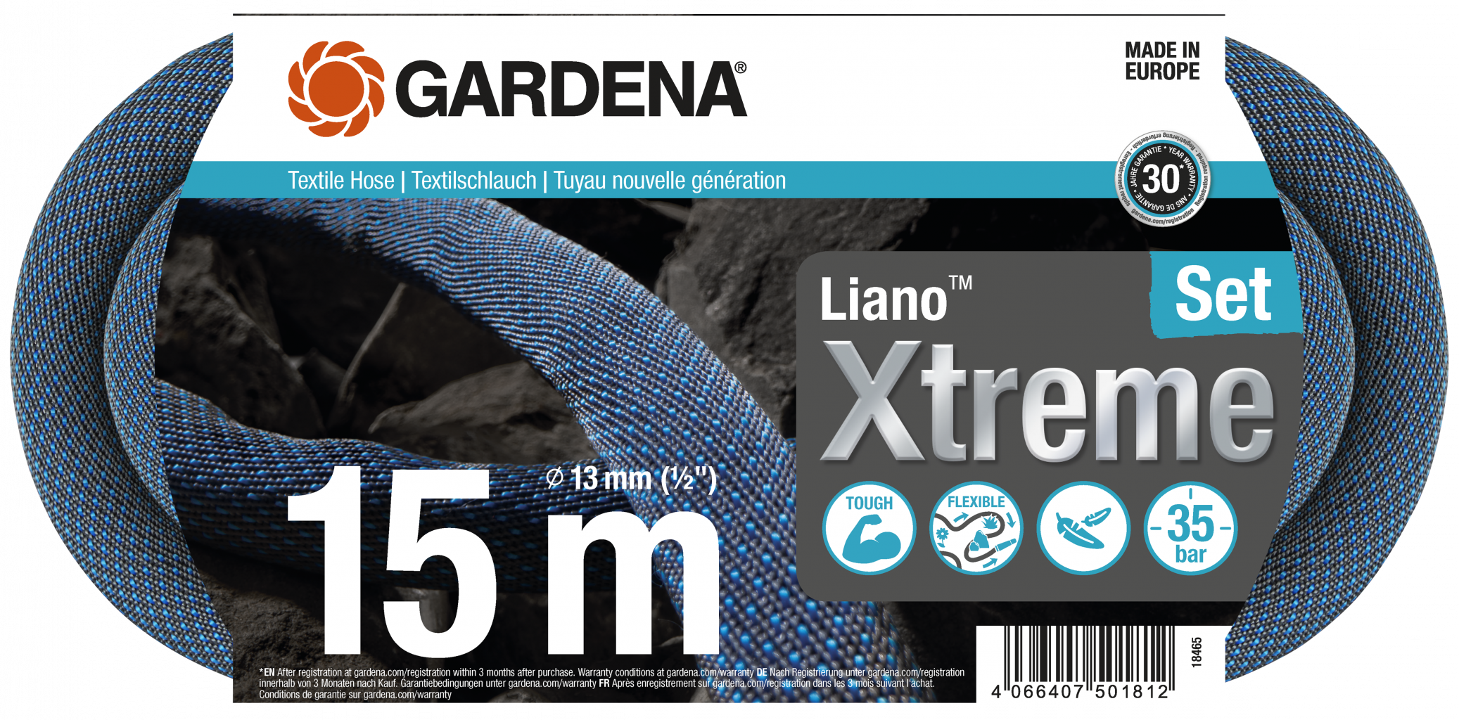 Dotaz na produkt Na splátky ještě dnesTextilní hadice Liano™ Xtreme 15 m prodávaná jako sada značky GARDENA je připravena k okamžitému použití. Odolná hadice Liano™ Xtreme je vhodná pro menší zahrady. Můžete ji použít pro každodenní potřeby a pro náročné a dlouhé zavlažování. Sada obsahuje 15 m dlouhou hadici o průměru 13 mm (1/2"), předmontované díly Original GARDENA System rychlospojku Liano™ a stopspojku Liano™, dvě šroubení na vodovodní kohoutek a postřikovač. Jedno ze dvou šroubení na kohoutek má redukční kloub, takže jej můžete použít pro celkem tři velikosti vodovodního kohoutku. Hadice se skládá z velmi flexibilní PVC vnitřní hadice s optimálním výkonem, zatímco díky inovativní vnější hadici, vyrobené z extrémně odolné textilní tkaniny, má hadice Liano™ Xtreme dlouhou trvanlivost. Pro své vynikající vlastnosti je inovativní Liano™ Xtreme určena speciálně pro náročné zahradní aktivity. Je velmi houževnatá, odpuzuje nečistoty a snadno si poradí s nerovným terénem, jako jsou dlažební kostky, trny růží nebo tahání kolem rohových zdí domu. Díky vynikající flexibilitě je manipulace se zahradní hadicí nad zemí snadná a hadice se nezalamuje. Příjemné držení zajišťuje pohodlnou manipulaci. Další výhodou hadice Liano™ Xtreme je její až o 50 % nižší hmotnost ve srovnání s konvenčními PVC hadicemi. Tím je zavlažování snazší, a to i po delší dobu. Flexibilita hadice Liano™ Xtreme vám také umožňuje skladovat ji prostorově úsporným způsobem, protože se ideálně přizpůsobí dostupnému úložnému prostoru. Tlak, při kterém dojde k prasknutí hadice, činí 35 bar. Díky odolnosti vůči UV záření a mrazu může zůstat venku po celý rok. Hadice Liano™ Xtreme neobsahuje škodlivé látky, ani ftaláty (<0,1 %), kadmium, olovo a baryum (<0,1 %). Vysoce kvalitní textilní hadice Liano™ Xtreme se vyrábí v Evropě a GARDENA vám poskytuje 30letou záruku výrobce po registraci na gardena.com/registration do 3 měsíců od jejího zakoupení. Stvořena pro extrém. Navržena pro každý den. Textilní hadice Liano™.