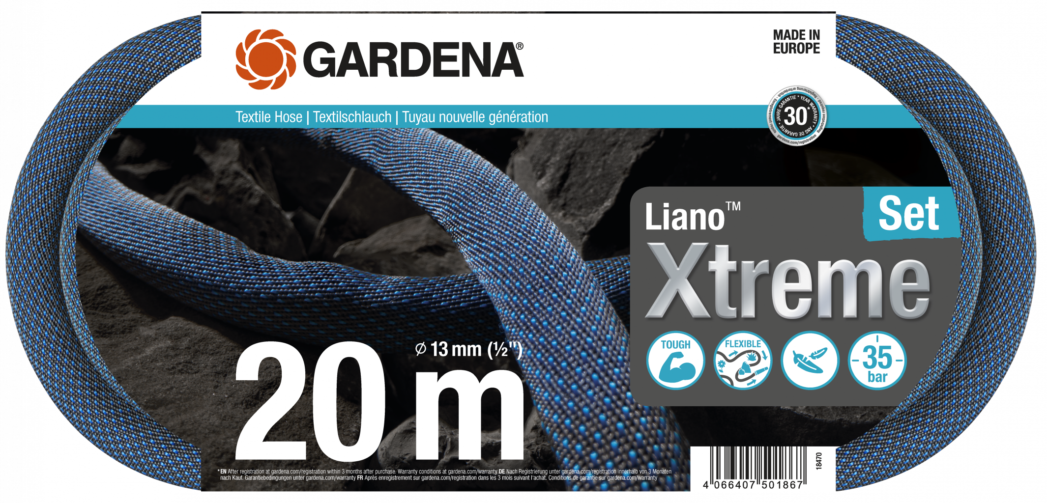 Dotaz na produkt Na splátky ještě dnesTato textilní hadice Liano™ Xtreme 20 m značky GARDENA se používá pro dlouhé a náročné zavlažování. S celkovou délkou 20 m je textilní hadice o průměru 13 mm (1/2") ideální pro středně velké zahrady. Díly Original GARDENA systému rychlospojka Liano™ a stopspojka Liano™ jsou již předmontované na Liano™ Xtreme. Navíc sada obsahuje dvě šroubení na vodovodní kohoutek a postřikovač. Protože je v jednom ze dvou šroubení na vodovodní kohoutek integrován redukční spoj, máte možnost připojit textilní hadici ke třem různým velikostem kohoutku. Liano™ Xtreme získává svůj mimořádný výkon, flexibilitu a vysokou odolnost vůči vnějším vlivům z velmi flexibilní vnitřní hadice z PVC a inovativní vnější hadice vyrobené z extrémně odolné textilní tkaniny. Díky tomu je odolná a připravená na náročné výzvy ve vaší zahradě. Zvládá drsný terén, dlažební kostky, trny z růží nebo tahání kolem zdi domu, aniž by se zauzlila nebo uvízla na překážkách. Hadice Liano™ Xtreme můžete pohodlně používat po delší dobu díky příjemnému, protiskluzovému úchopu a nízké hmotnosti. Textilní hadice odpuzující nečistoty je až o 50 % lehčí než běžné PVC hadice. Po zavlažování můžete Liano™ Xtreme skladovat prostorově úsporným způsobem, například na polici nebo v kůlně, díky její dobré flexibilitě. Přizpůsobí se dostupnému úložnému prostoru. Tlak, při kterém dojde k prasknutí hadice, činí 35 bar. Díky své odolnosti vůči UV záření a mrazu může zůstat na zahradě po celý rok. Textilní hadice bez škodlivých látek neobsahuje ftaláty (<0,1 %), kadmium, olovo a baryum (<0,1 %). Po registraci na gardena.com/registration do 3 měsíců od nákupu nabízí GARDENA jako výrobce na tuto vysoce kvalitní textilní hadici Liano™ Xtreme, která se vyrábí v Evropě, záruku v trvání 30 let. Stvořena pro extrém. Navržena pro každý den. Textilní hadice Liano™.
