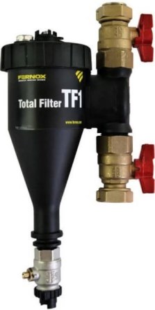 Fernox Total Filter TF1 je unikátní filtr na principu cyklonového odlučovače a účinku magnetického pole, určený k montáži přímo do topného okruhu, konstruovaný pro použití s přípravky na úpravu vody řady Fernox F. Hydro-cyklonový filtr a magnetický filtr TF1 odstraňuje z topného systému magnetické i nemagnetické nečistoty. Umístění je možné jak na vertikální, tak i horizontální potrubí. Součástí zařízení je dávkovací ventil pro čistící chemii řady Fernox "F".