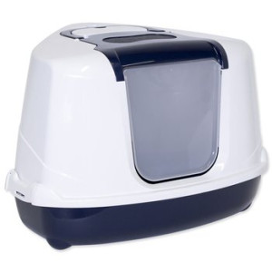 Dotaz na produktRohová toaleta pro kočky s plastovým krytem, dvířky, filtrem a lopatkou.