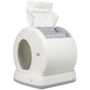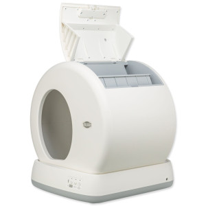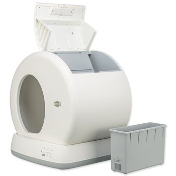 Toaleta je vybavena automatickým čisticím mechanismem, který po odchodu kočky prosije hrudkující stelivo.