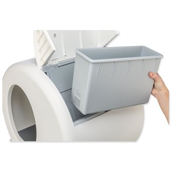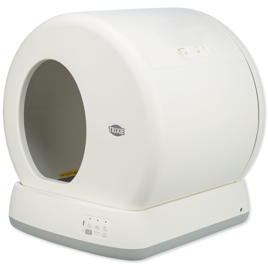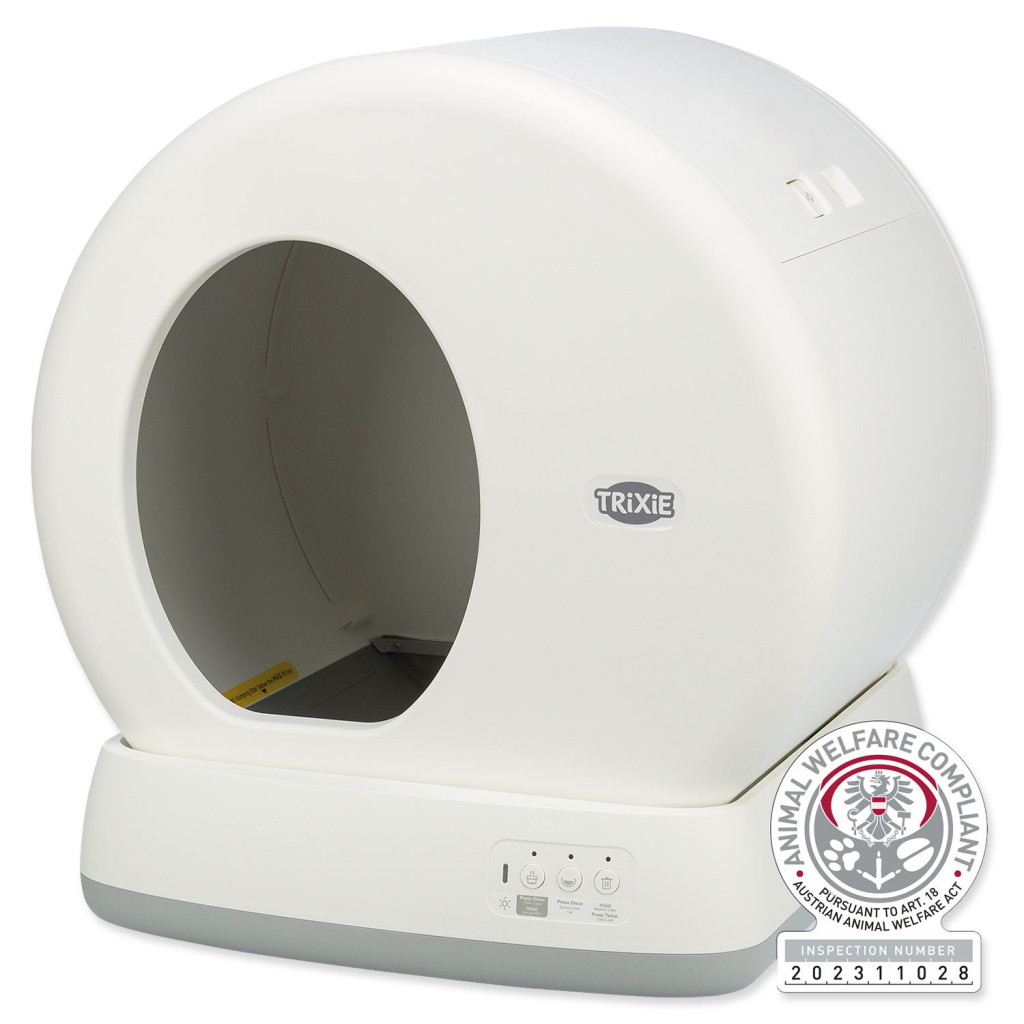 Automatická toaleta Trixie v bílé barvě, vybavena systémem, který po každém použití otáčí buben a odděluje nečistoty od čistého steliva. Díky tomu je toaleta neustále čistá a připravená pro další použití.
