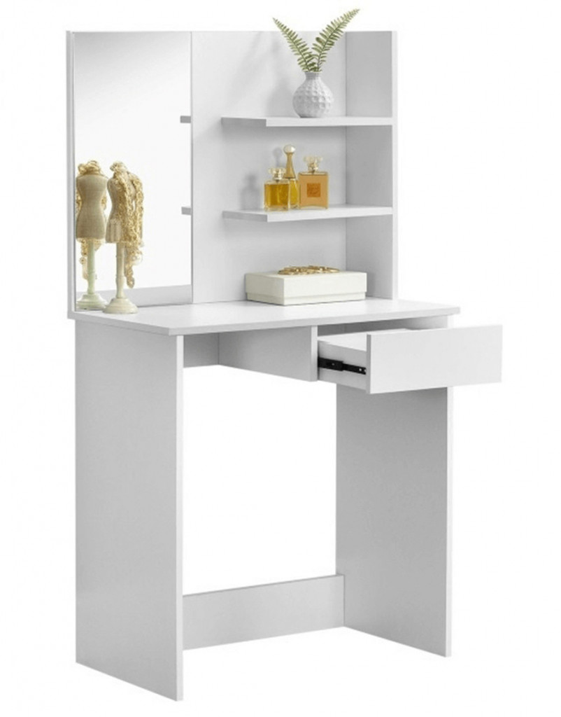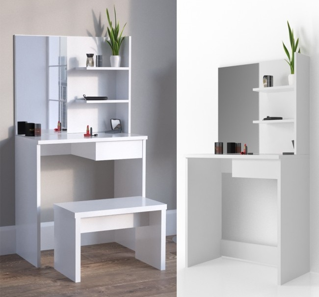 Dotaz na produkt Na splátky ještě dnesToaletní stolek se zrcadlem je vyroben z desky LTD v barvě bílá (korpus) v kombinaci s lakovanou deskou v bílém lesku (22 mm). Stolek obsahuje 1 praktickou zásuvku. Stolička k toaletnímu stolku není součástí a nelze dokoupit. Dodáváme v demontovaném stavu. DOPRODEJ!