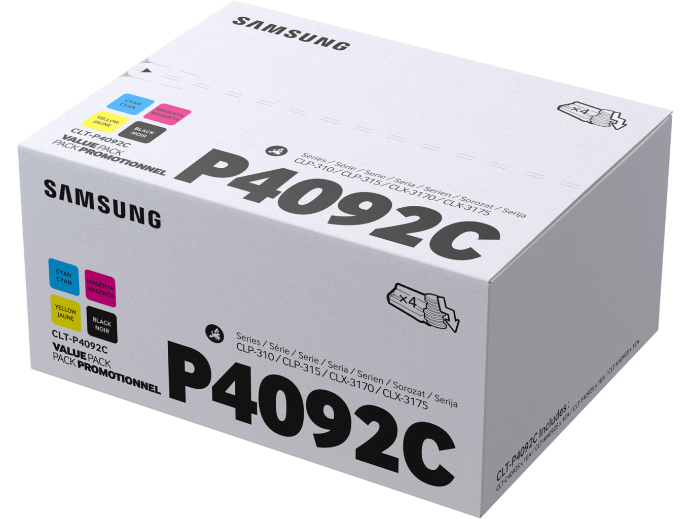 Samsung CLT-P4092C je sada tonerů barev C, M, Y, K určená pro tiskárny Samsung CLP-310 / 315 / CLX-3170 / 3175. Poskytuje kapacitu 1 500 stran černý toner a 1 000 stran barevné tonery při 5% pokrytí.