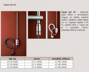 Dotaz na produkt Na splátky ještě dnesTopná tyč GT - elektrické topné těleso s termostatem reaguje na teplotu topného media v radiátoru, délka kabelu 1,3 m, regulace teploty 5-75 °C, izolační třída I. Topná tyč je v metalicky stříbrném provedení a výkon topné tyče je 300 W.