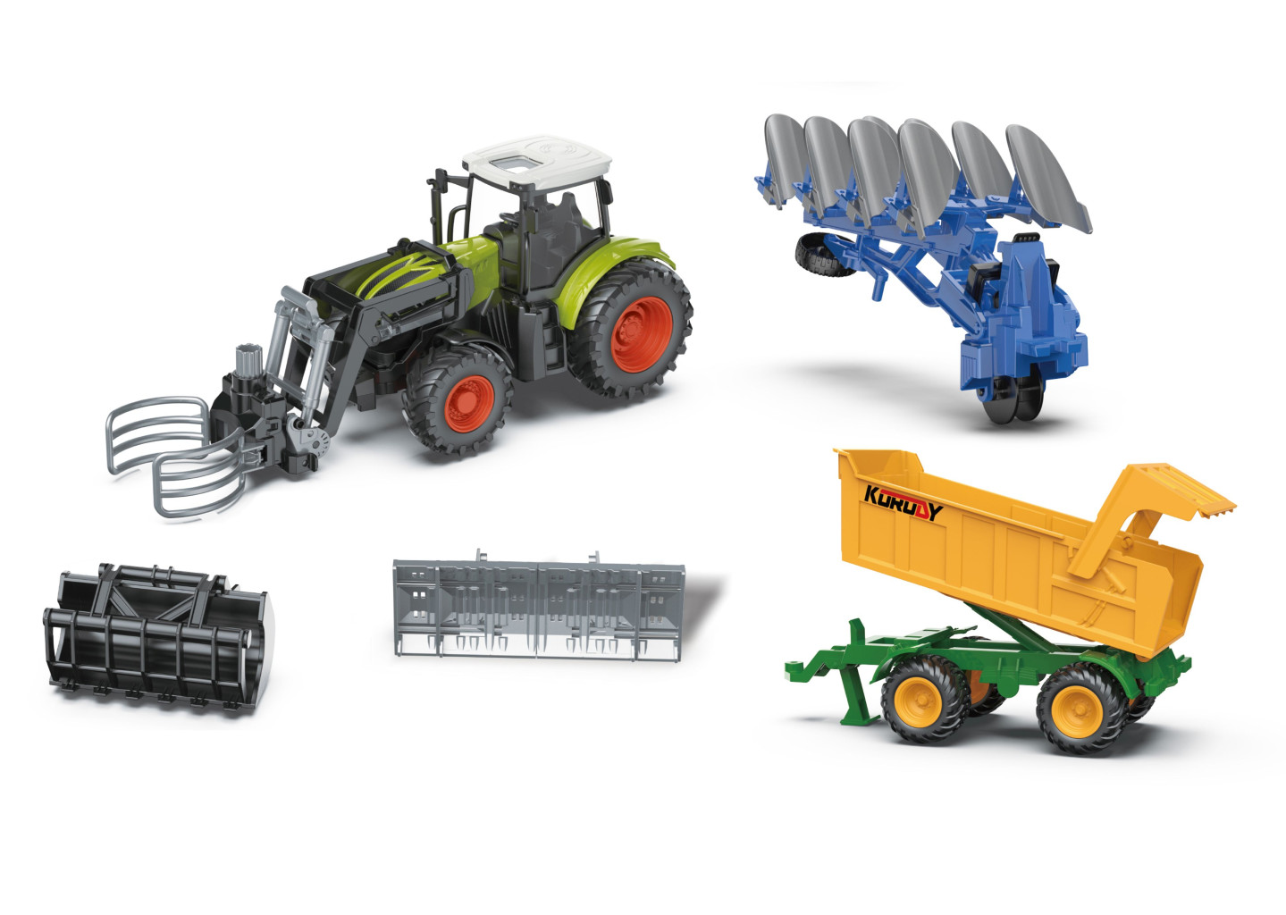 Dotaz na produktTraktor nakladač s efekty a příslušenstvím. Velikost traktoru 29 cm. Volná kola. Světelné a zvukové efekty stlačení přední části traktoru. 3xAG13 baterie součástí. Součástí 3 přípojná zařízení (1 přední, 2 zadní).