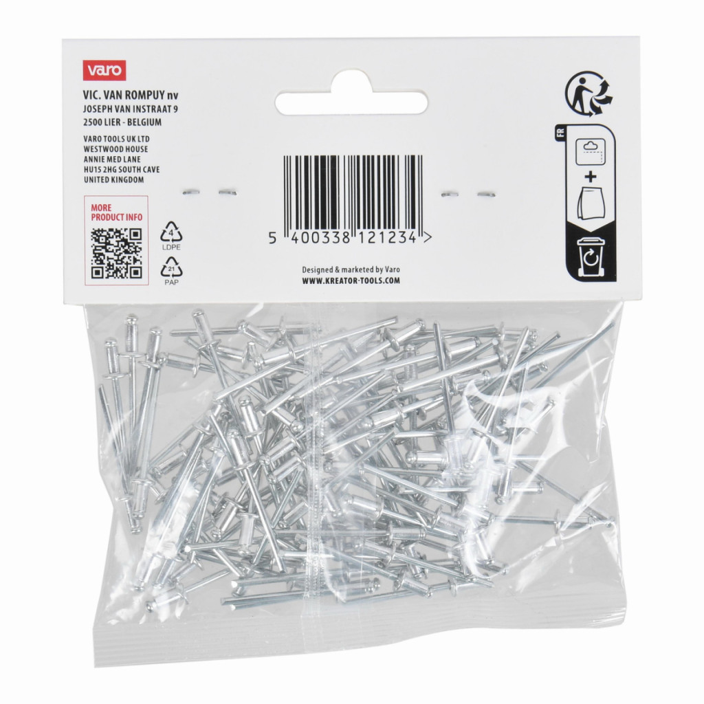 Dotaz na produktTyto trhací nýty KRTH62702 z naší řady Kreator mají průměr 3,2 mm. Používejte je k rychlému a bezšroubovému spojení kovových, hliníkových nebo plastových předmětů o tloušťce až 3 mm. To se provádí pomocí nýtovacích kleští. Balení obsahuje 100ks.