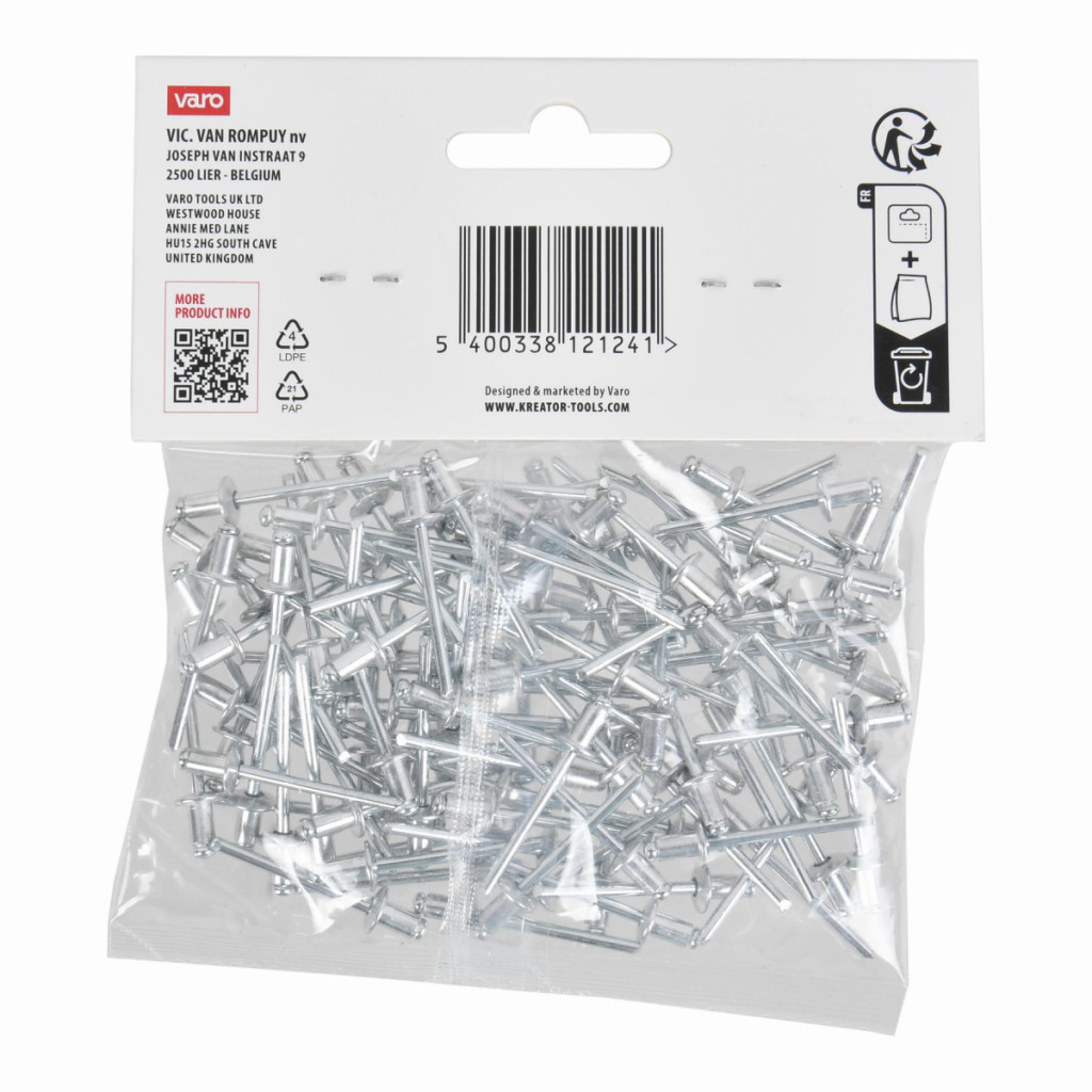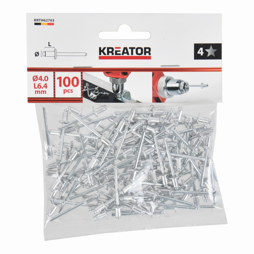 Dotaz na produktTyto trhací nýty KRTH62703 z naší řady Kreator mají průměr 4,0 mm. Používejte je k rychlému a bezšroubovému spojení kovových, hliníkových nebo plastových předmětů o tloušťce až 3 mm. To se provádí pomocí nýtovacích kleští. Balení obsahuje 100ks.