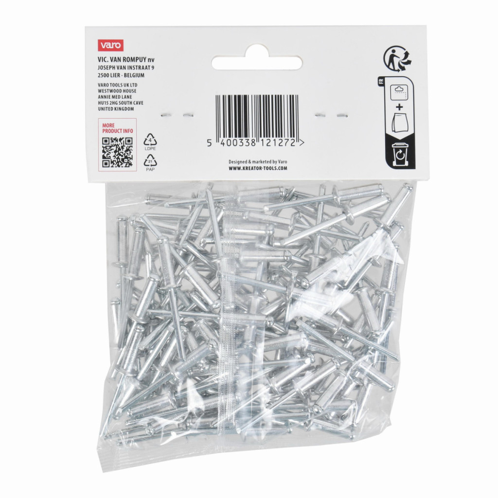Dotaz na produktTyto trhací nýty KRTH62706 z naší řady Kreator mají průměr 4,8 mm. Používejte je k rychlému a bezšroubovému spojení kovových, hliníkových nebo plastových předmětů o tloušťce až 12 mm. To se provádí pomocí nýtovacích kleští. Balení obsahuje 100ks.