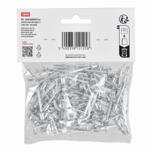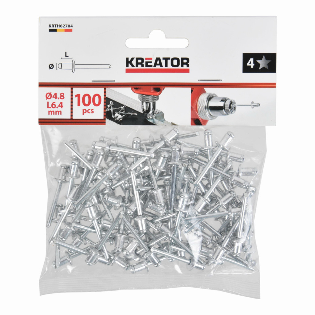 Dotaz na produktTyto trhací nýty KRTH62704 z naší řady Kreator mají průměr 4,8 mm. Používejte je k rychlému a bezšroubovému spojení kovových, hliníkových nebo plastových předmětů o tloušťce až 3 mm. To se provádí pomocí nýtovacích kleští. Balení obsahuje 100ks.