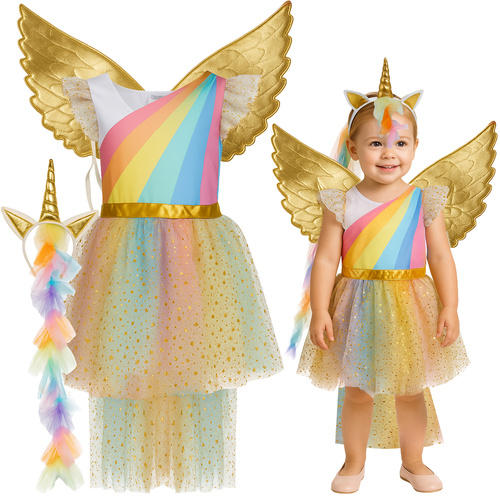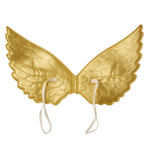 kompletní sada – šaty, zlatá křídla a čelenka s rohem, nemusíš nic doplňovat – Vyndáte ho z obalu a outfit je připravený na hraní nebo na ples
