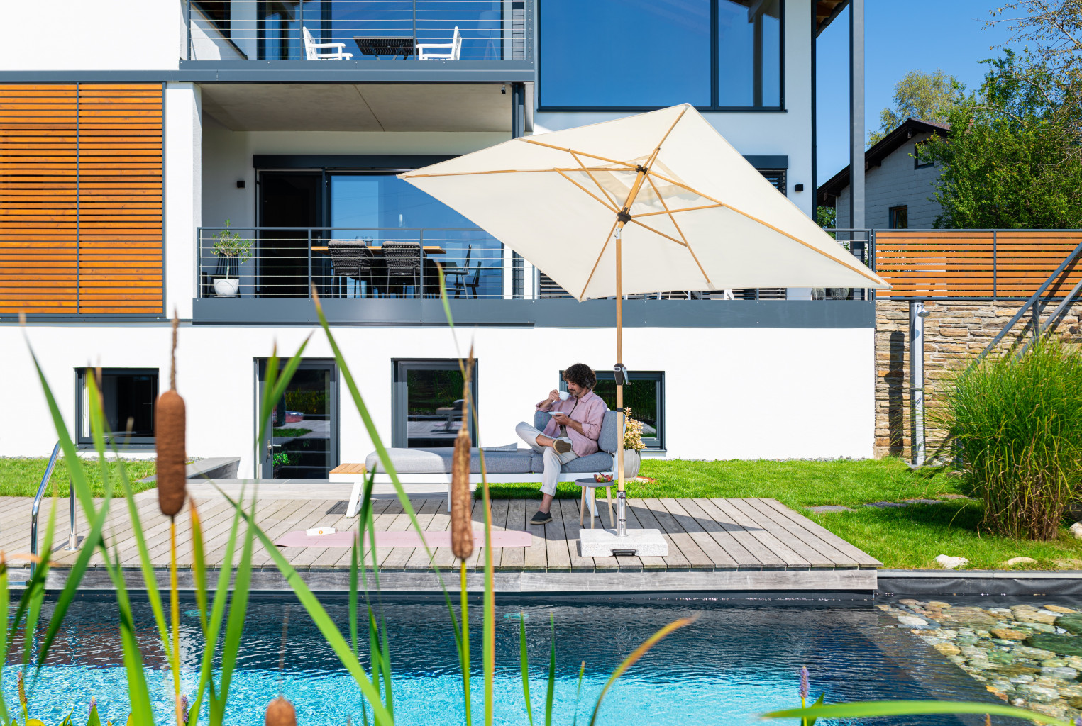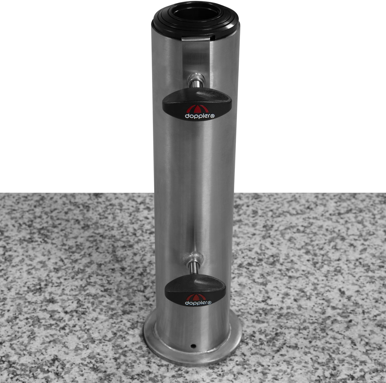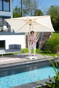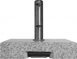 Žulový stojan TROLLEY 70 kg Tento stojan ze světle šedé leštěné žuly je vybavený 2 koly a rozšiřitelnou trolejovou rukojetí pro snadnější přesouvání. Slunečník se kotví do trubky z nerezové oceli a zajišťuje pomocí dvou pojistných šroubů. Trubka má několik redukčních kroužků, které umožňují použití průměrů tyče slunečníku 32–60 mm. Díky hmotnosti 70 kg je zajištěna bezpečná stabilita i středně velkých středových slunečníků až do průměru střechy 350 cm. Žula je mimořádně tvrdá a odolná, takže podstavec je absolutně odolný vůči vlivům počasí. Musíme však zdůraznit, že žula je přirozený produkt, takže struktura a barva se může změnit. Informace o produktu: hmotnost: 70 kg vhodné pro středové slunečníky až do 350 cm pro průměry tyče od 32 do 60 mm základna: leštěná žulová deska trubka: nerezová ocel, nerez výška stoupání: 30 cm s 2 koly (plastové) a zatahovatelnou rukojetí k dispozici jsou redukční kroužky včetně 2 zajišťovacích šroubů rozměry: cca 50 x 50 x 11 cm (délka x šířka x výška) DŮLEŽITÉ: Žula je přírodní produkt. Odchylky ve struktuře a barvě jsou vyhrazeny.