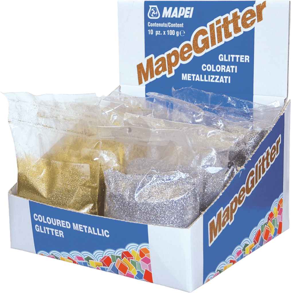 Stříbrné kovové glittery. Určeny k namíchání výhradně se spárovací hmotou Kerapoxy Design v množství max. do 10% hmotnosti. Výsledkem je třpytivý, kovový lesk spáry.