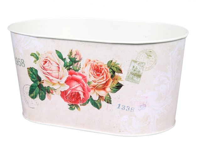 Dotaz na produktPlechový oválný truhlík s obrázkem květů růží, potiskem razítek a známek. Šířka: 23 cm, výška: 11 cm, hloubka: 14 cm.