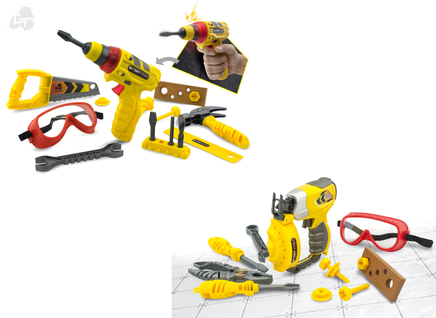 Dotaz na produktTuff Tools Nářadí set s brýlemi. Obsah balení - elektrická vrtačka se světelnými a zvukovými efekty, ochranné brýle, šrouby s maticemi 6ks, 4 vyměnitelné vrtáky a šroubováky, klíč, pila, kladívko. 3xAG13 baterie jsou součástí balení.