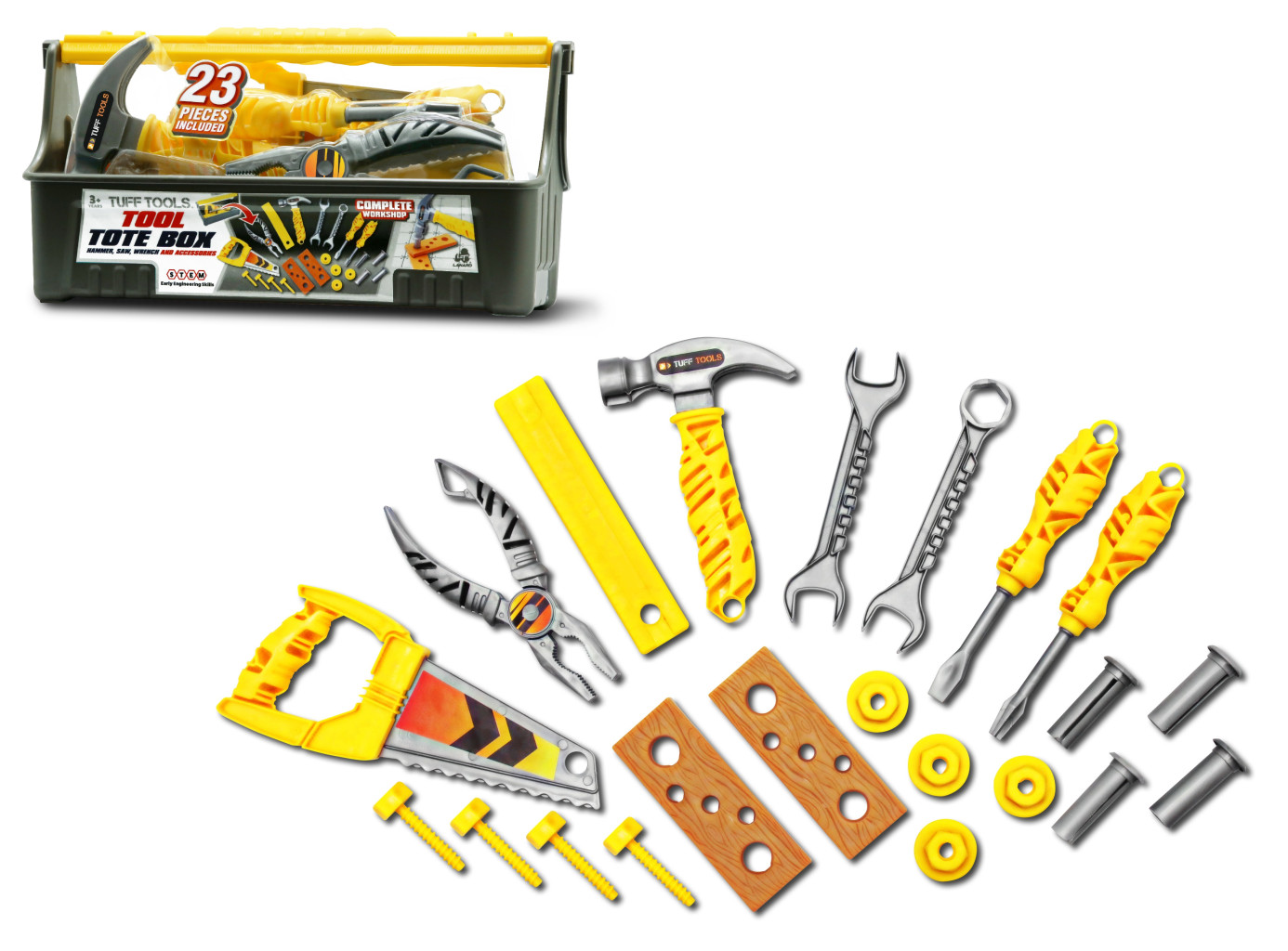 Dotaz na produktTuff Tools Nářadí v kufříku set. Rozměry kufříku 30x14,5x15 cm. Rukojeť kufříku je možné vyjmout a použít jako pravítko. Balení obsahuje 8 ks ručního nářadí, spojovací díly, šroubky, matice, a hřebíky.