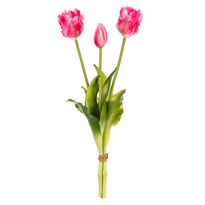 Dotaz na produktSvazek tří řezaných tulipánů v růžové barvě je vyroben z měkkého plastu, který věrně napodobuje přirozenou strukturu květů i listů. Každý květ má detailně zpracované okraje okvětních lístků a stonky jsou svázány přírodním provázkem. Svazek je vhodný pro aranžmá v interiéru, kde přinese svěží barevný akcent bez potřeby údržby.