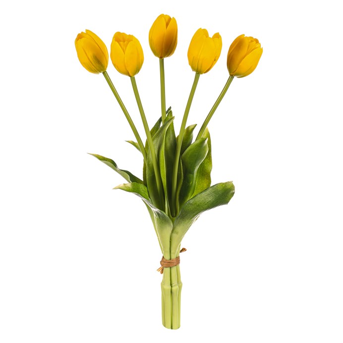 Dotaz na produktSvazek pěti žlutých tulipánů z měkkého plastu přináší do interiéru svěží a trvalou dekoraci. Každý květ je detailně zpracovaný s přirozenými odstíny listů, které doplňují živý vzhled celého svazku. Díky použití umělého materiálu je možné květiny umístit do různých prostor bez nutnosti péče o živé rostliny. Svazek je svázán přírodním provázkem, který podtrhuje celkový přírodní dojem. Vynikne v květináči, váze nebo jako součást větších aranžmá.