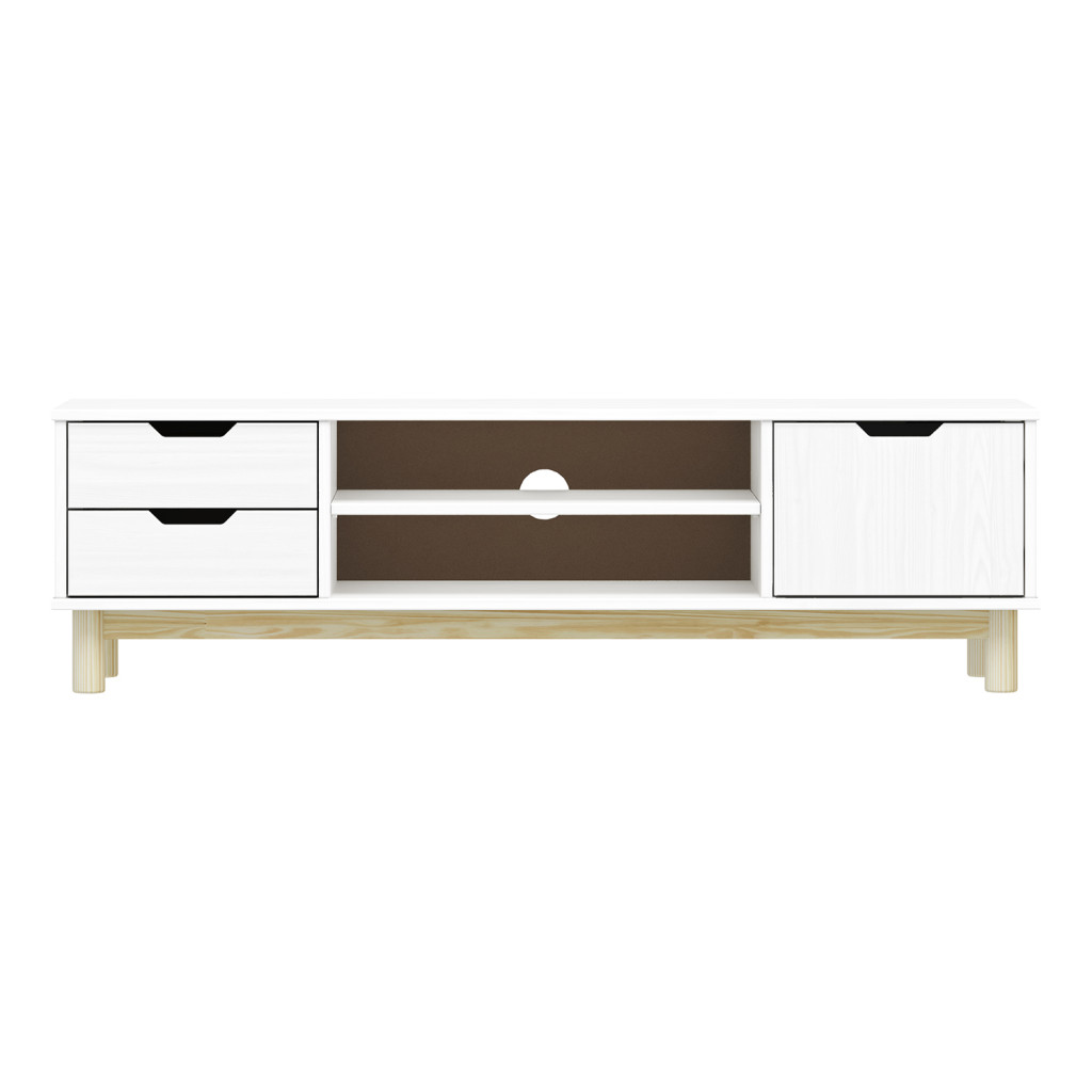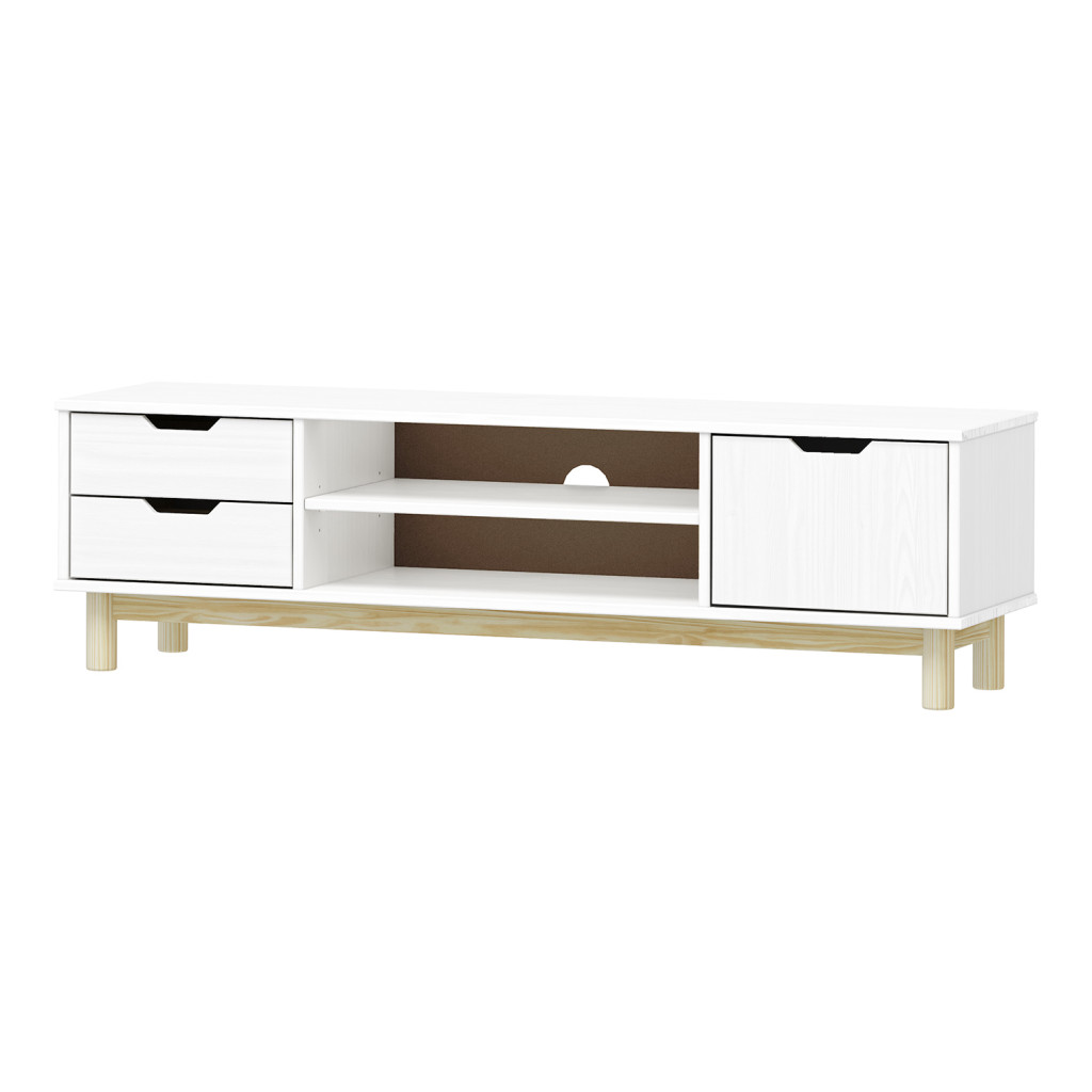Dotaz na produkt Na splátky ještě dnesmateriál masiv borovice, barevné provedení bílý lak 2 zásuvky s kovovými pojezdy, 1 dvířka, 1 police otvor na protažení kabelů