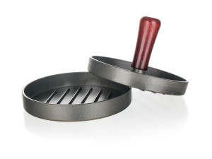 Forma na výrobu hamburgerů z mletého masa vyrobená z litého hliníku a opatřená nepřilnavým povrchem doplněna dřevěným madlem.