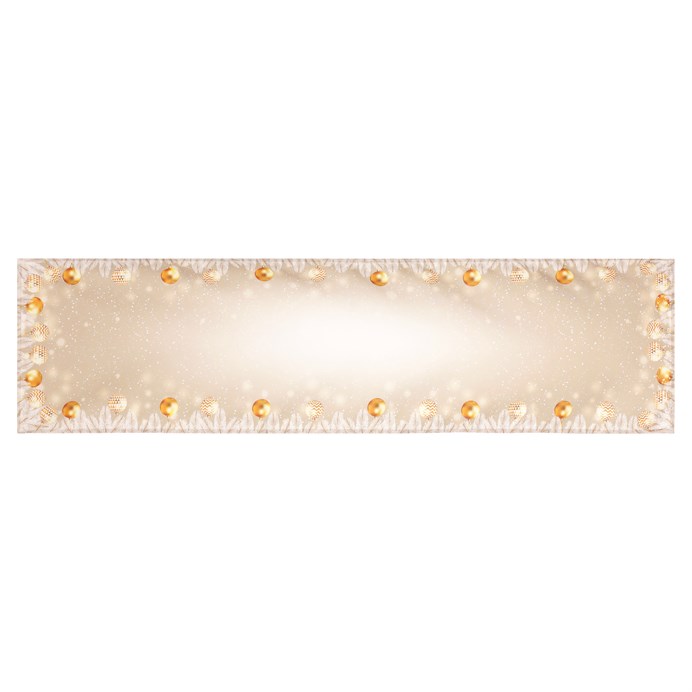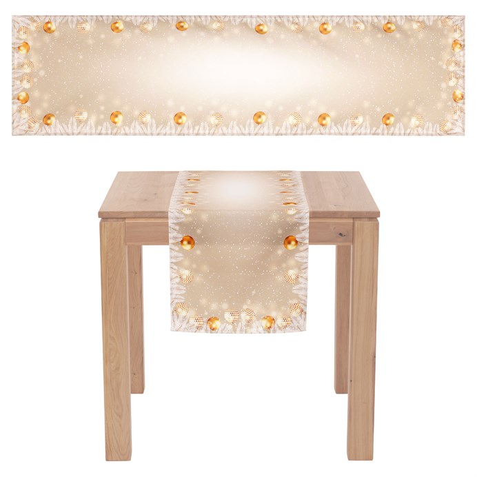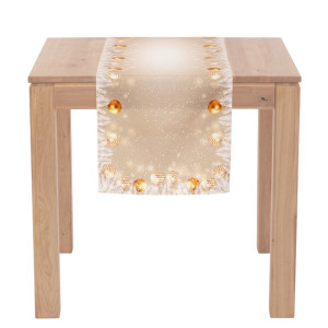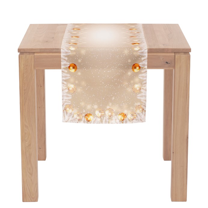 Dotaz na produktJemný dekor v dokonalém spojení elegance a vánočních prvků dělá z tohoto běhounu jedinečný doplněk pro váš interiér nachystaný na nejkrásnější svátky v roce. S motivem ozdobných koulí rozprostřených na zlatém podkladu se bude vyjímat jak na konferenčním, tak i jídelnovém stole nebo na komodě stojící poblíž ozdobeného stromku. Lze snadno kombinovat s dalšími textiliemi a dekoracemi.