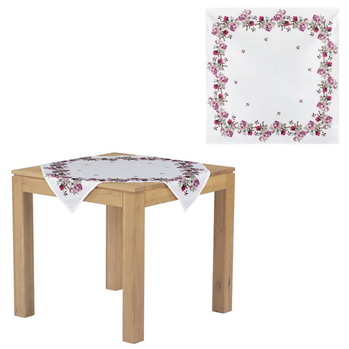 Dotaz na produktUbrus s motivem růží bílé barvy. Rozměr 80x80 cm. Materiál 100 % polyester. Praní na 30°C.