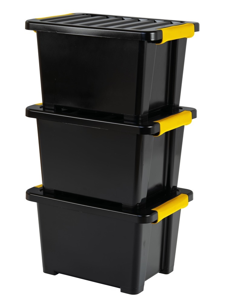 Dotaz na produktSada 3 úložných plastových boxů s víkem. Každý box má objem 15L. Moderní design a kvalitní provedení od švýcarské značky Rotho. Lesklá černá barva. Víka jsou opatřena žlutými postranními úchyty pro bezpečné zaklapnutí. Boxy lze snadno stohovat na sebe - ideální řešení pro přehledné a úsporné skladování.