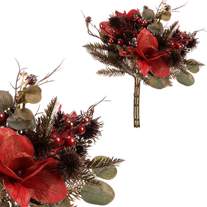 Dotaz na produktElegantní kytice z umělých větviček a květin přináší sváteční atmosféru v té nejkrásnější podobě. Kombinace nádherných květů, jehličí, bobulí, šišek a lístků vytváří bohatou a harmonickou kompozici, která ozdobí váš interiér po celé svátky i dlouho poté. Stačí ji umístit do vázy a užívat si její krásu rok co rok, bez starostí o opadávání či ztrátu čerstvosti.