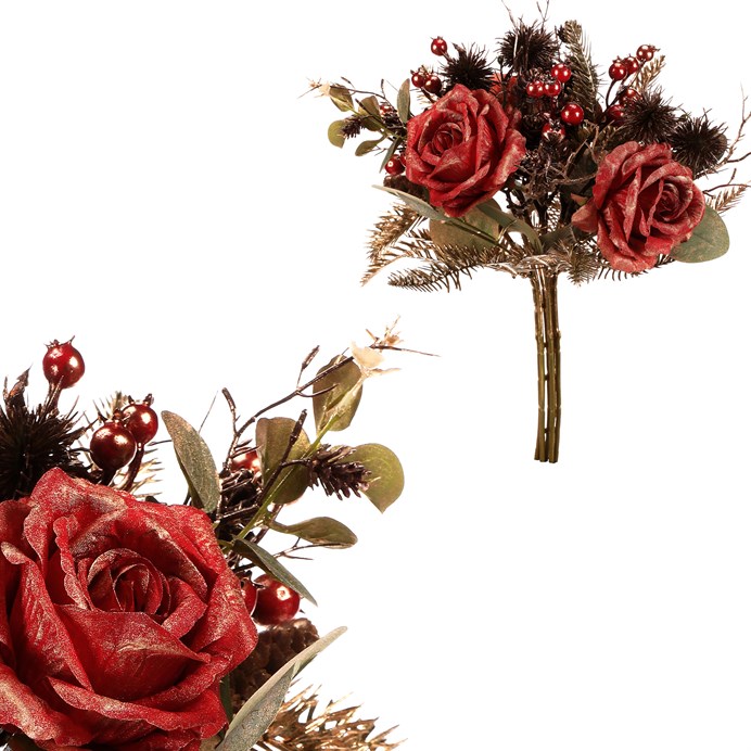 Dotaz na produktElegantní, jemně pozlacená kytice z umělých větviček a květin přináší sváteční atmosféru v té nejkrásnější podobě. Kombinace nádherných květů růží, jehličí, bobulí, šišek a lístků vytváří bohatou a harmonickou kompozici, která ozdobí váš interiér po celé svátky i dlouho poté. Stačí ji umístit do vázy a užívat si její krásu rok co rok, bez starostí o opadávání či ztrátu čerstvosti.