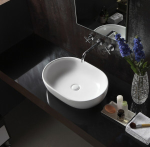 Keramické umyvadlo na desku. Součástí dodávky není vodovodní baterie - doporučujeme nástěnnou umyvadlovou baterii nebo vysokou stojánkovou.
