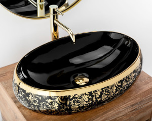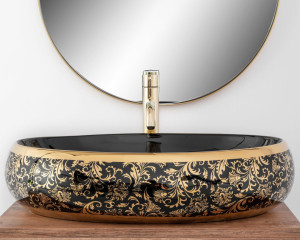 Dotaz na produkt Na splátky ještě dnesPředstavujeme Vám moderní nové umyvadlo na desku série Rea Meryl. Umyvadlo obdélníkového tvaru je vyrobeno z materiálů nejvyšší kvality a jeho vlastnosti splní veškeré vaše požadavky. Tento model ocení především zákazník, hledající nejen funkční, ale také estetické řešení. Umyvadlo je určeno k montáži na desku, ale je možné ho kombinovat i se skřínkou. Umyvadlo v černém lesklém provedení s pozlaceným okrajem a zlatým květovým vzorem na vnější straně se navíc díky speciální fázi výroby snadno čistí a je velice odolné. CADProducent: Rea