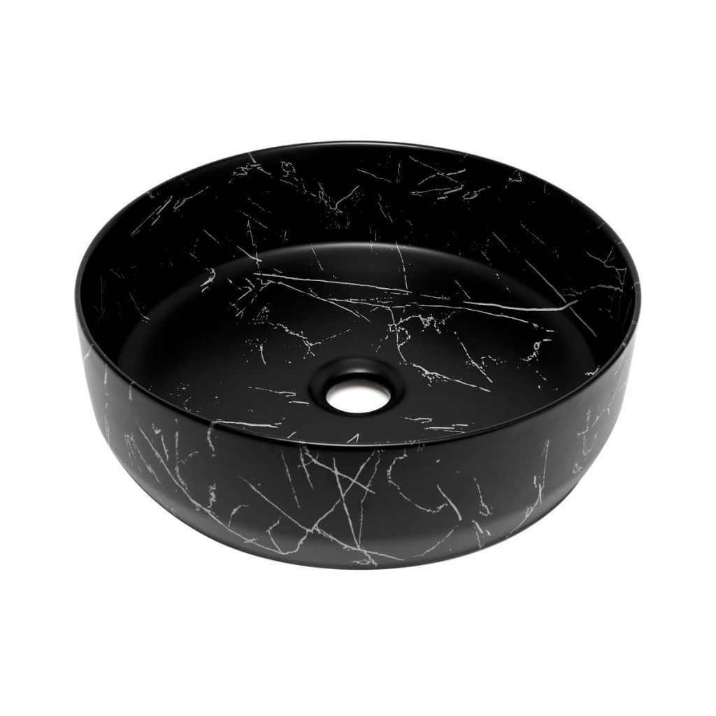 Matné tenkostěné umyvadlo na desku série Infinitio v černé barvě v designu mramoru a rozměrech 39x39 cm promění vaši koupelnu v moderní oázu relaxace.