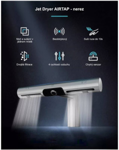 Dotaz na produkt Na splátky ještě dnesInovativní design vysoušeče Jet Dryer AIRTAP - Brushed kombinuje tryskový vysoušeč s automatickou vodovodní baterií. Ruce si tak můžete pohodlně umýt i vysušit na jednom místě – přímo v umyvadle. Jet Dryer AIRTAP - Brushed je vybaven HEPA filtrem. Vodovodní baterie i vysoušeč je bezkontaktní pro maximálně hygienický provoz. Díky tomu, že má každé umyvadlo svůj vysoušeč, provoz na toaletách je plynulý a bez front.