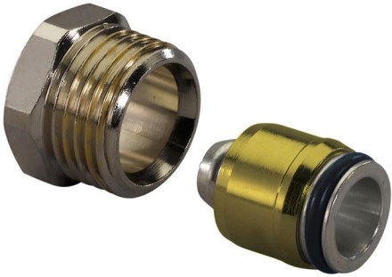 - tlakový šroub s vnějším závitem se spojenou objímkou a prstencem, přizpůsobený radiátorovým ventilům Danfoss s vnitřním závitem