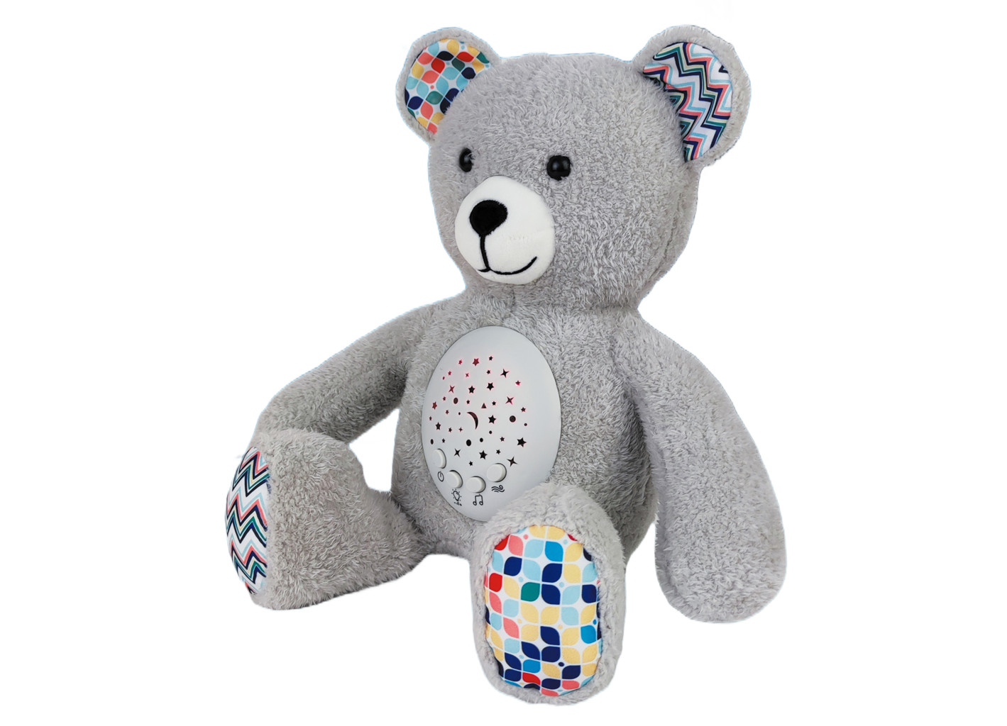 Dotaz na produktUsínáček s projekcí medvěd. Velikost 24cm. Baterie 3xAA nejsou součástí. Tlačítko ON//OFF přidržením po dobu 2s se zapne/vypne. Tlačítko světla jedním stisknutím rozsvítí projekci, další stisknutí zvyšují intenzitu svícení a 4.stisknutím se zhasne. Tlačítko s notou spouští ukolébavky. Celkem 7 písniček, které se přepínají opětovným stisknutím. Tlačítko s vlnou zapíná bílý šum. Stisknutím se spustí jeden ze tří bílých šumů, který trvá vždy 30min a poté se vypne. Další bílý šum se spustí až po stisknutí tlačítka. Projektor lze vyjmout z bříška medvěda.