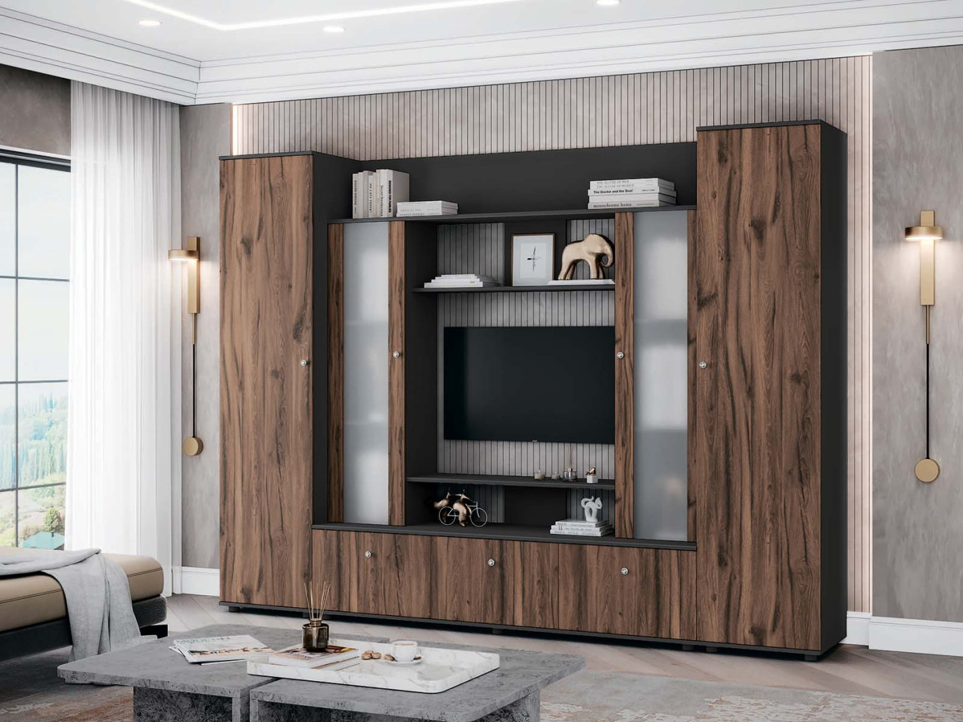 Sestava obsahuje dvě skříně, dvě vitríny a tři skříňky, což poskytuje velkorysý prostor pro uložení i vystavení dekorací, knih, elektroniky či osobních předmětů. Obývací stěna tak spojuje praktické využití s nadčasovým vzhledem.