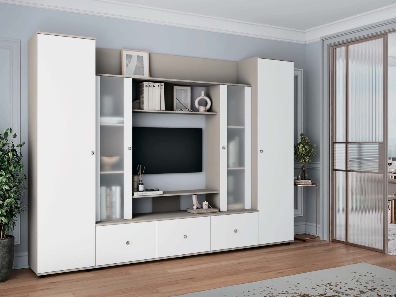 Sestava obsahuje dvě skříně, dvě vitríny a tři skříňky, což poskytuje velkorysý prostor pro uložení i vystavení dekorací, knih, elektroniky či osobních předmětů. Obývací stěna tak spojuje praktické využití s nadčasovým vzhledem.