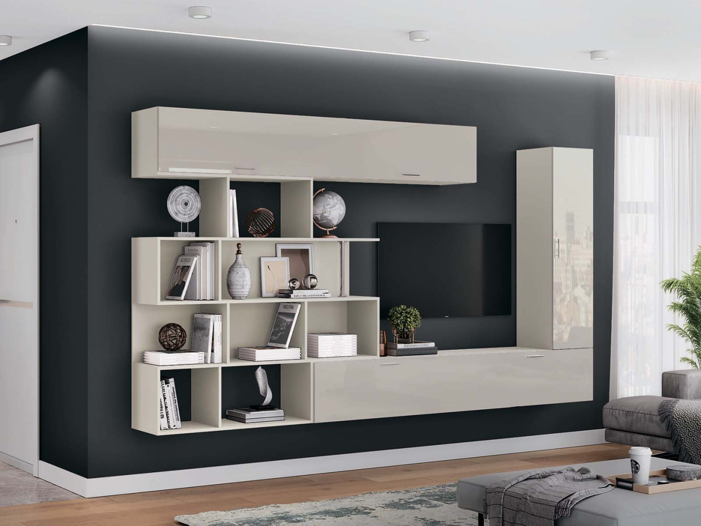 Promyšlené uspořádání zahrnuje tři skříňky a praktický regál, které umožňují přehledné uložení elektroniky, dekorací i každodenních doplňků. Obývací stěna tak spojuje estetiku s praktickým využitím.
