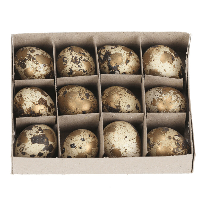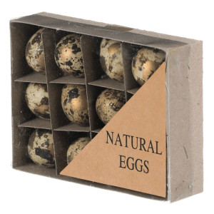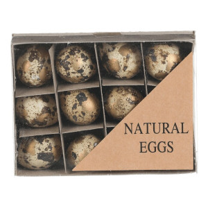 Dotaz na produktSada pravých křepelčích vajíček s kropenatým vzorem a pozlacenými detaily přináší do interiéru přírodní a zároveň dekorativní prvek. Každé vajíčko je unikátní díky přirozené kresbě a jemnému zlatému zdobení, které zvýrazňuje jejich estetickou hodnotu. Balení obsahuje 12 kusů, které jsou pečlivě uspořádány v kartonovém boxu s oddělovacími přihrádkami pro bezpečné skladování a snadnou manipulaci. Vajíčka jsou ideální pro sezónní dekorace, aranžmá nebo kreativní projekty, kde vynikne jejich přírodní textura a barevné odstíny v béžové škále.